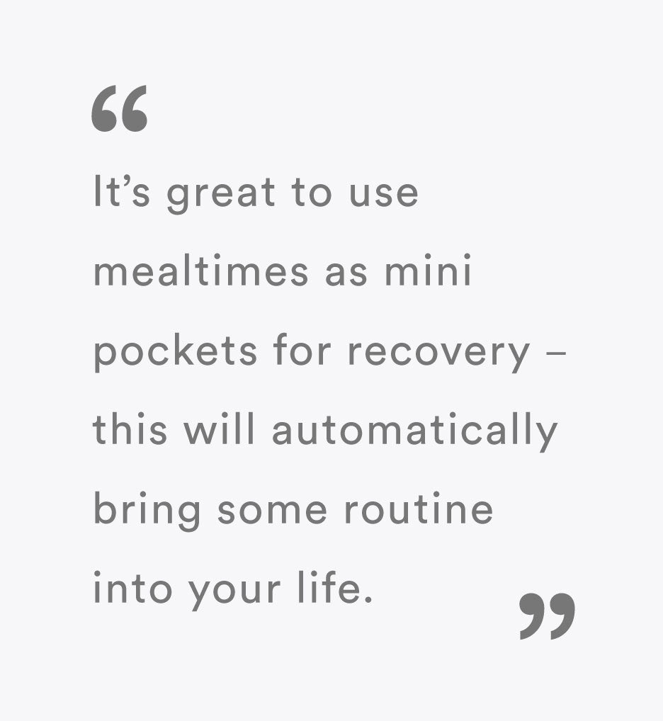 Being self-employed, it’s important to keep some routine in my life otherwise it can feel a bit chaotic. If I have a deadline, I might work late into the evening but then I will schedule an extra day off when needed. The other thing about being self-employed is that I do tend to work all hours and not give myself enough time off, so I think it’s important to try and maintain some boundaries around that. I’ll say this to my clients too. It’s great to use mealtimes as mini pockets for recovery - this will automatically bring some routine into your life. I categorically never miss a meal, I mean I love food anyway, but more to the point it breaks up the day in a positive way.