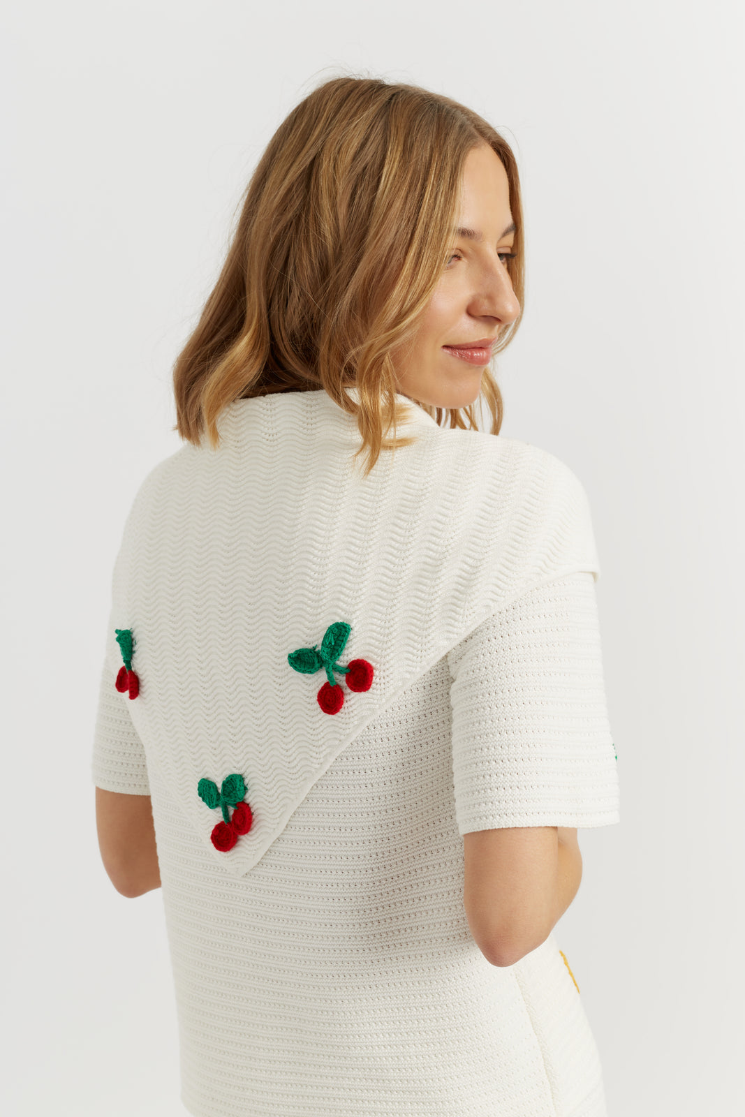 Crafted from soft, breathable cotton, this Cream bandana features a wavy stitch finish with hand-embroidered cherry motifs. Light and playful, it adds a joyful touch to summer looks. Style with your favourite summer collection.