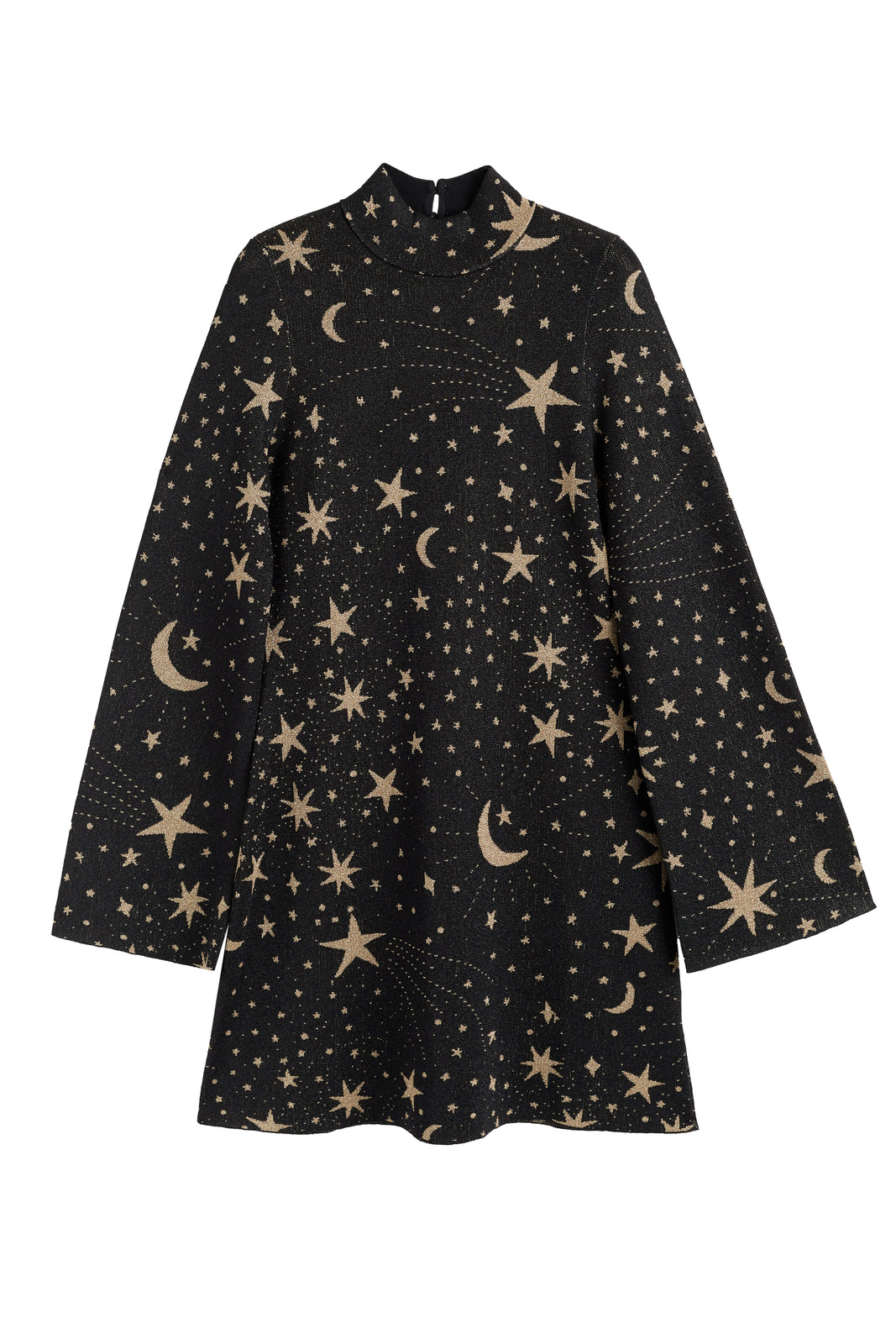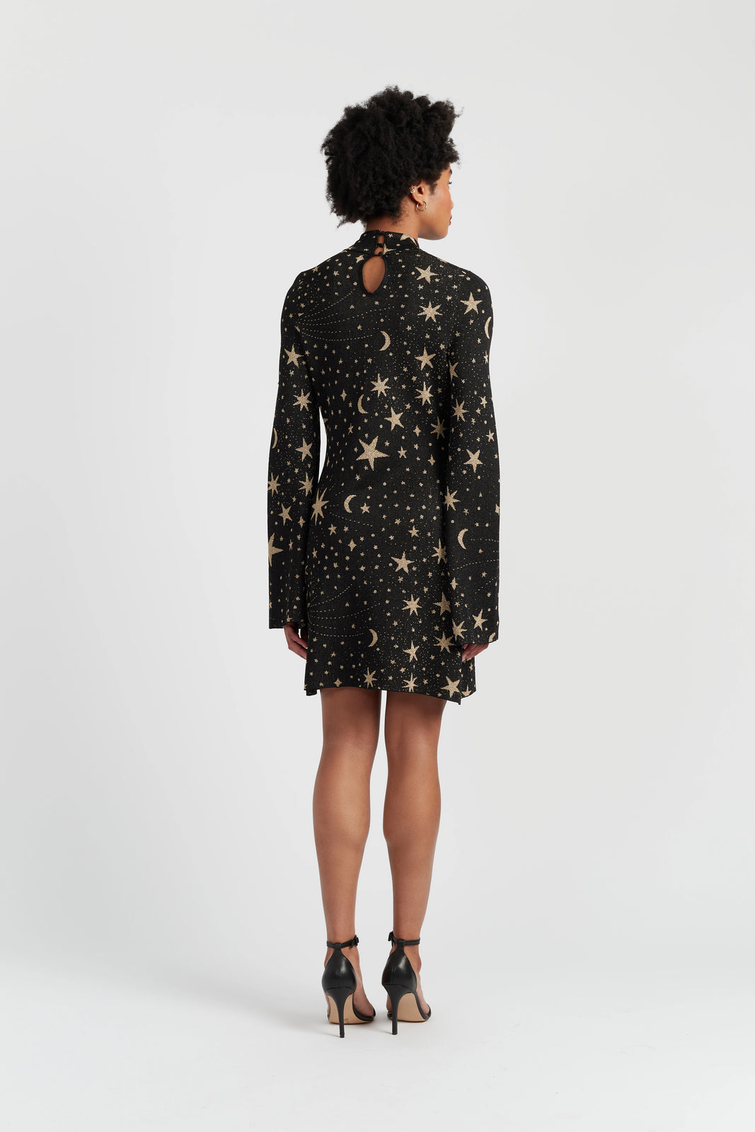 A true star of the season, this celestial mini dress is crafted in a soft, fluid fabric that drapes beautifully. It is covered in a scattered gold moon-and-stars print, it’s designed with a high neck, flared sleeves, and swingy silhouette.