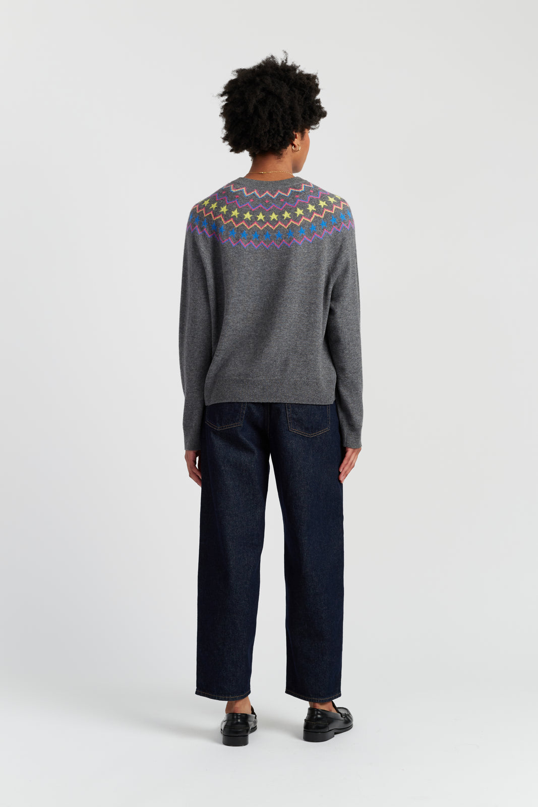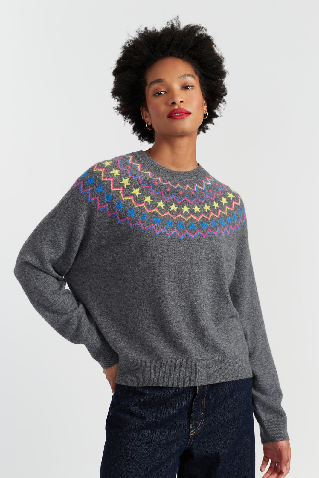 An elevated take on a heritage classic. Crafted from an ultra-soft cashmere blend, this grey crewneck sweater features a vibrant multicoloured Fair Isle yoke. Designed for warmth without bulk, its slightly boxy fit makes it perfect for layering or wearing solo with jeans or tailored trousers.