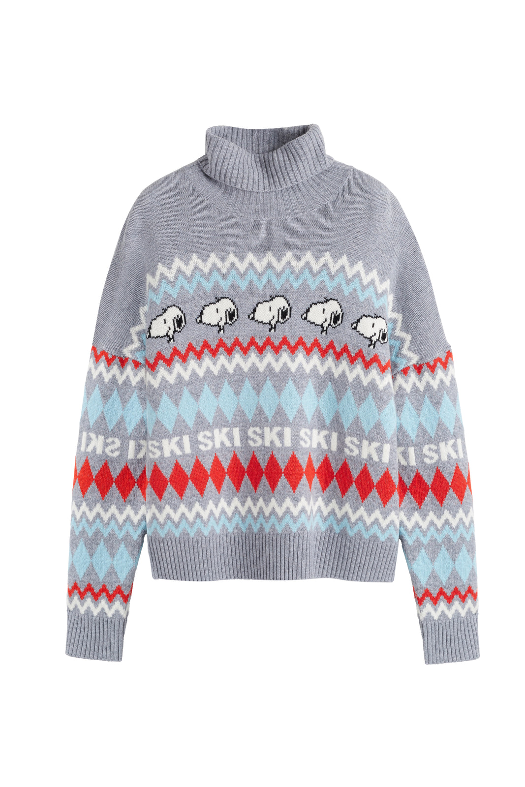 Playful meets alpine chic in this statement roll neck, featuring a bold Fair Isle pattern and marching Snoopy faces across the chest. Knitted in a soft wool and cashmere blend, it brings warmth and whimsy to your winter wardrobe.