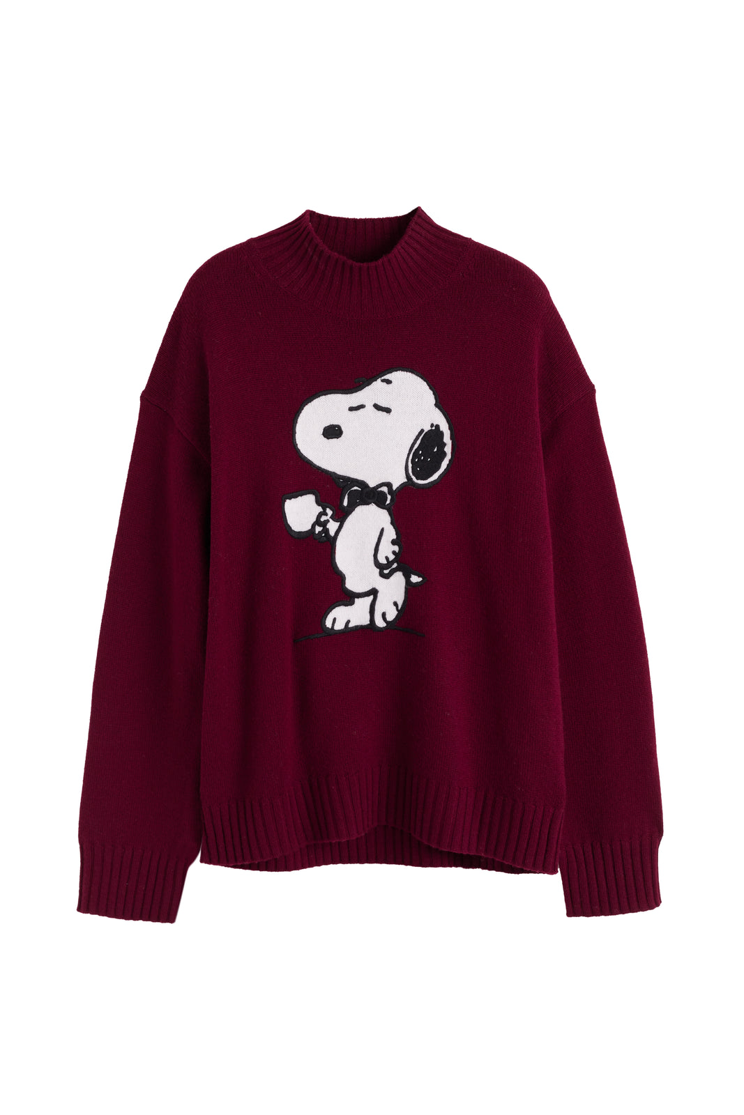 The Claret Wool-Cashmere Tea Time Snoopy Sweater is a Relaxed.
