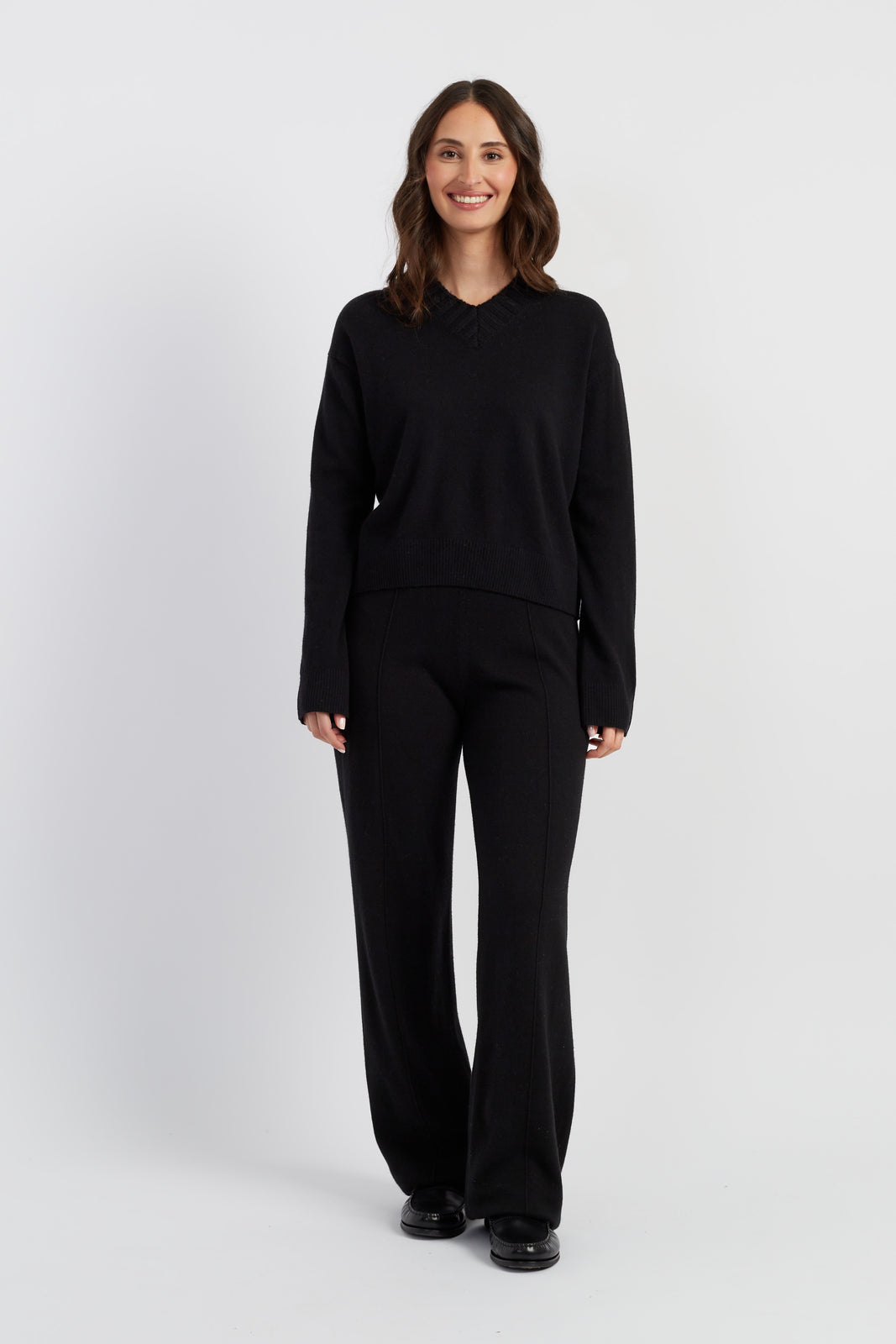 The Black Wool-Cashmere Ribbed V-neck Sweater is a Relaxed.