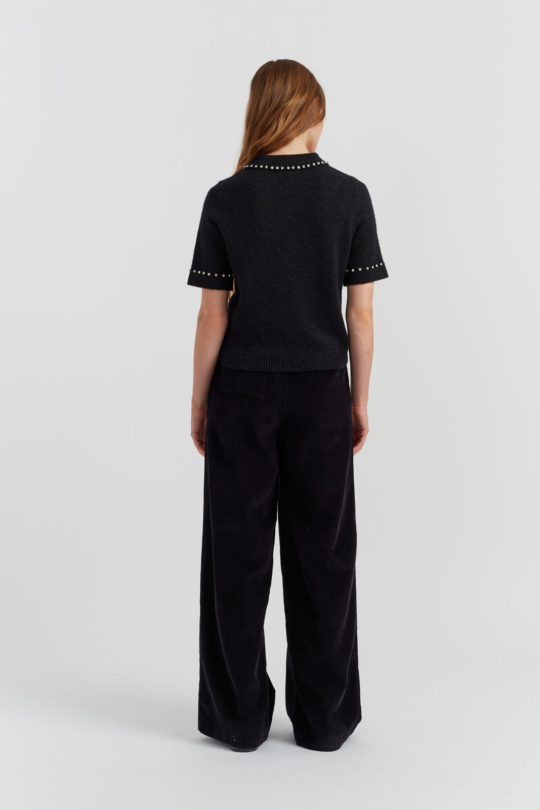 • Crystal stud embellishments at collar and cuffs