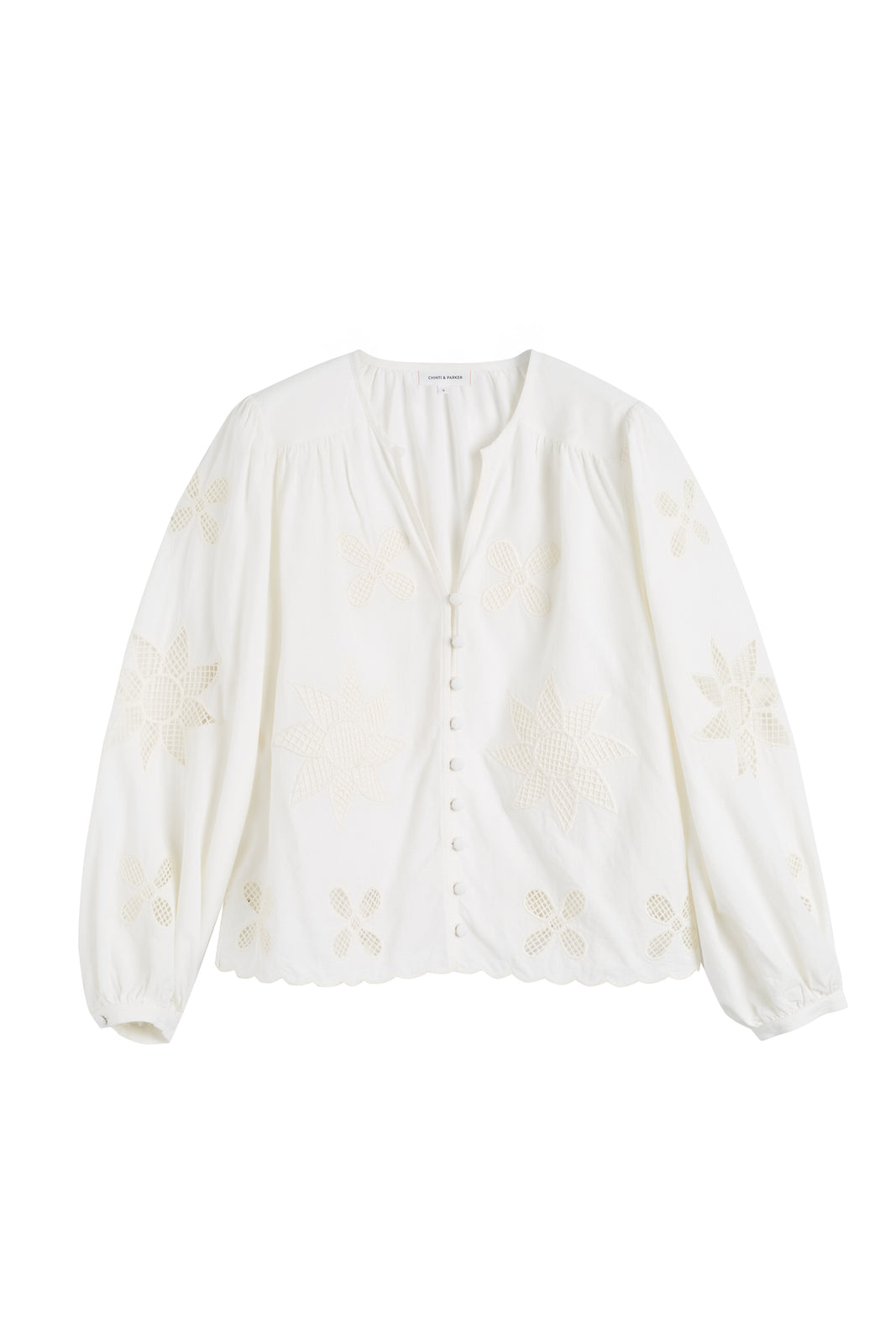 The Cream Linen-Blend Broderie Blouse is a Classic Fit.