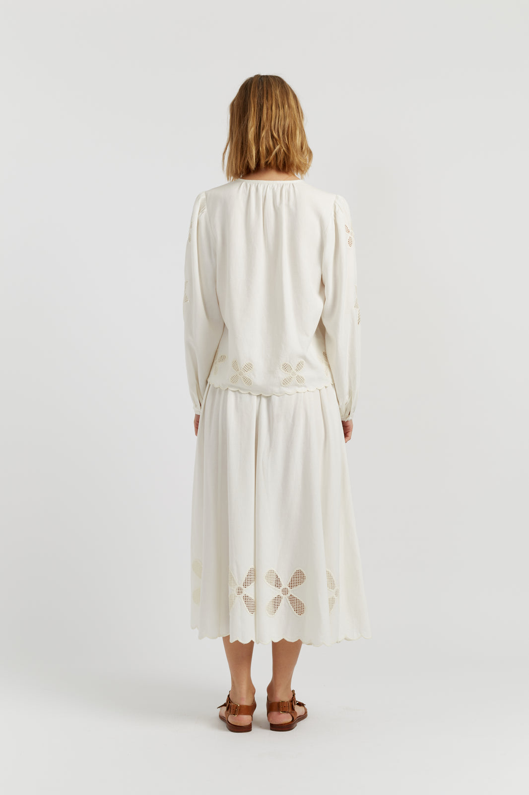 Made from a lightweight linen-blend, this Cream broderie blouse features delicate embroidered artwork and a classic silhouette. Style with the matching skirt or tailored trousers for an elevated summer look.