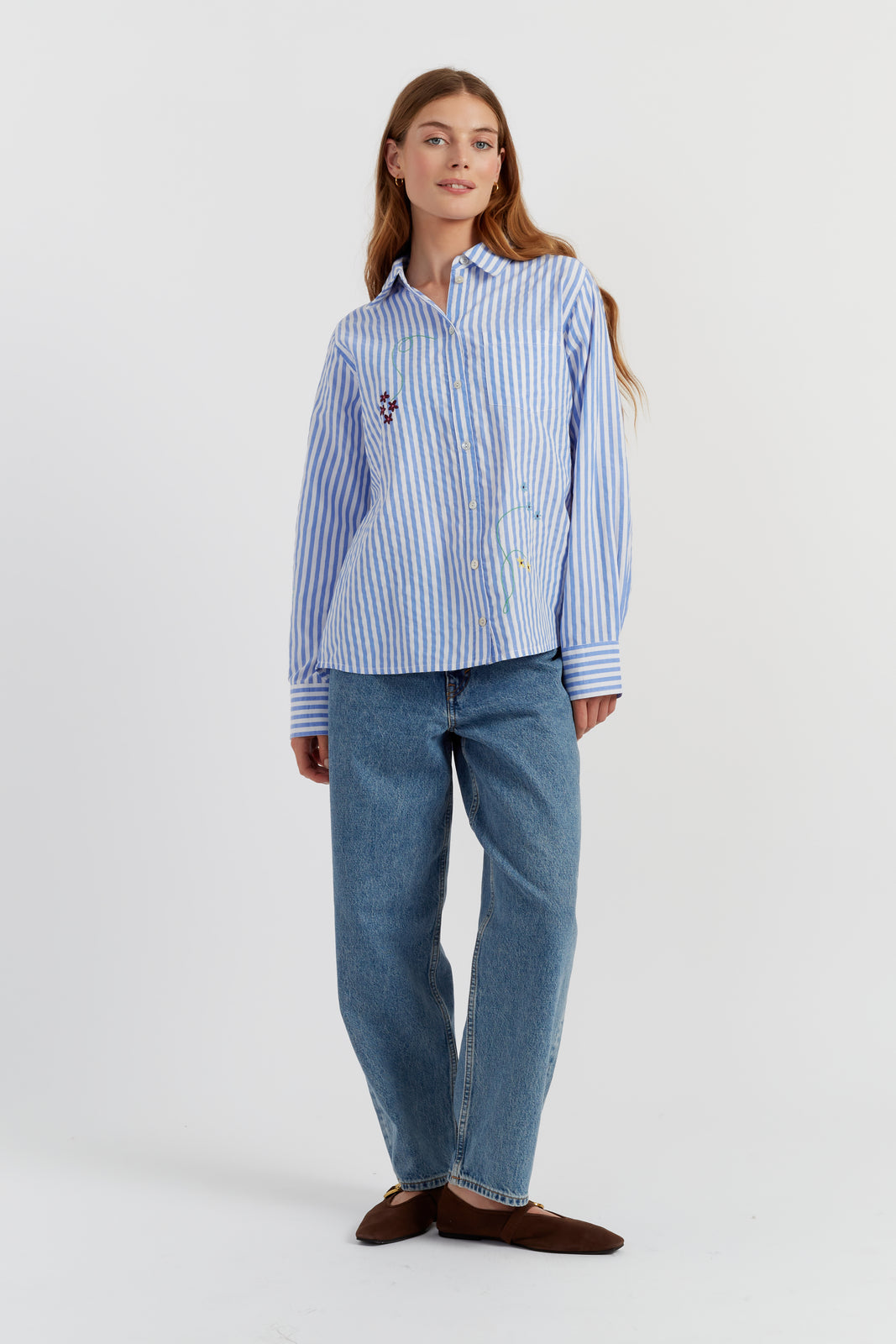 This refined blue-striped cotton shirt is brought to life with delicate floral embroidery. Combining crisp shirting with playful detailing, it’s designed for a relaxed fit and finished with a neat collar - a joyful update to a wardrobe staple.