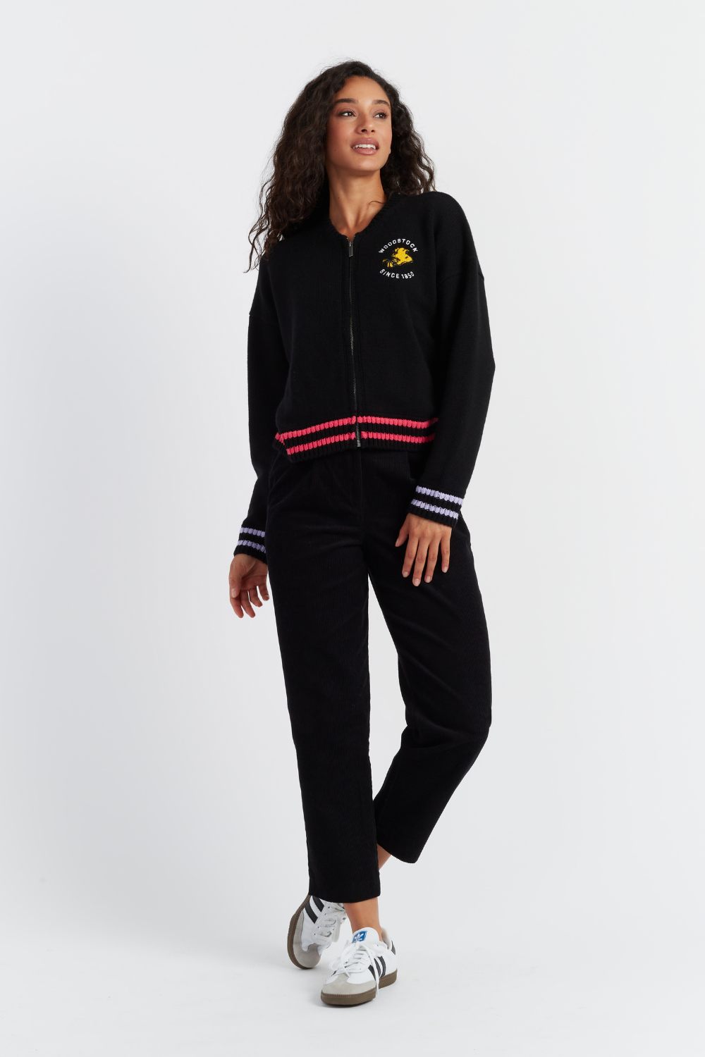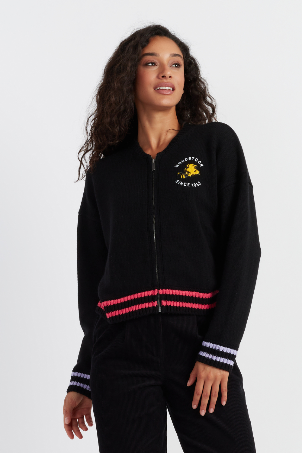 The black bomber jacket’s sports-inspired silhouette is enhanced by ribbed trims, stripes at the waistband and cuffs, and a zip front fastening, and is detailed with a Woodstock intarsia at the chest and turns to reveal the word 'Peanuts' across the back.