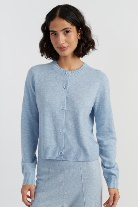 The Baby-Blue Wool-Cashmere Crew Neck Cardigan is a Classic.