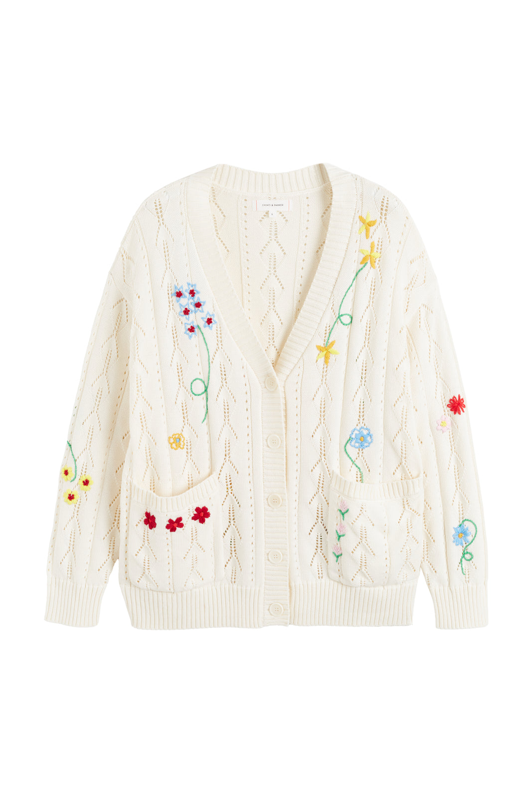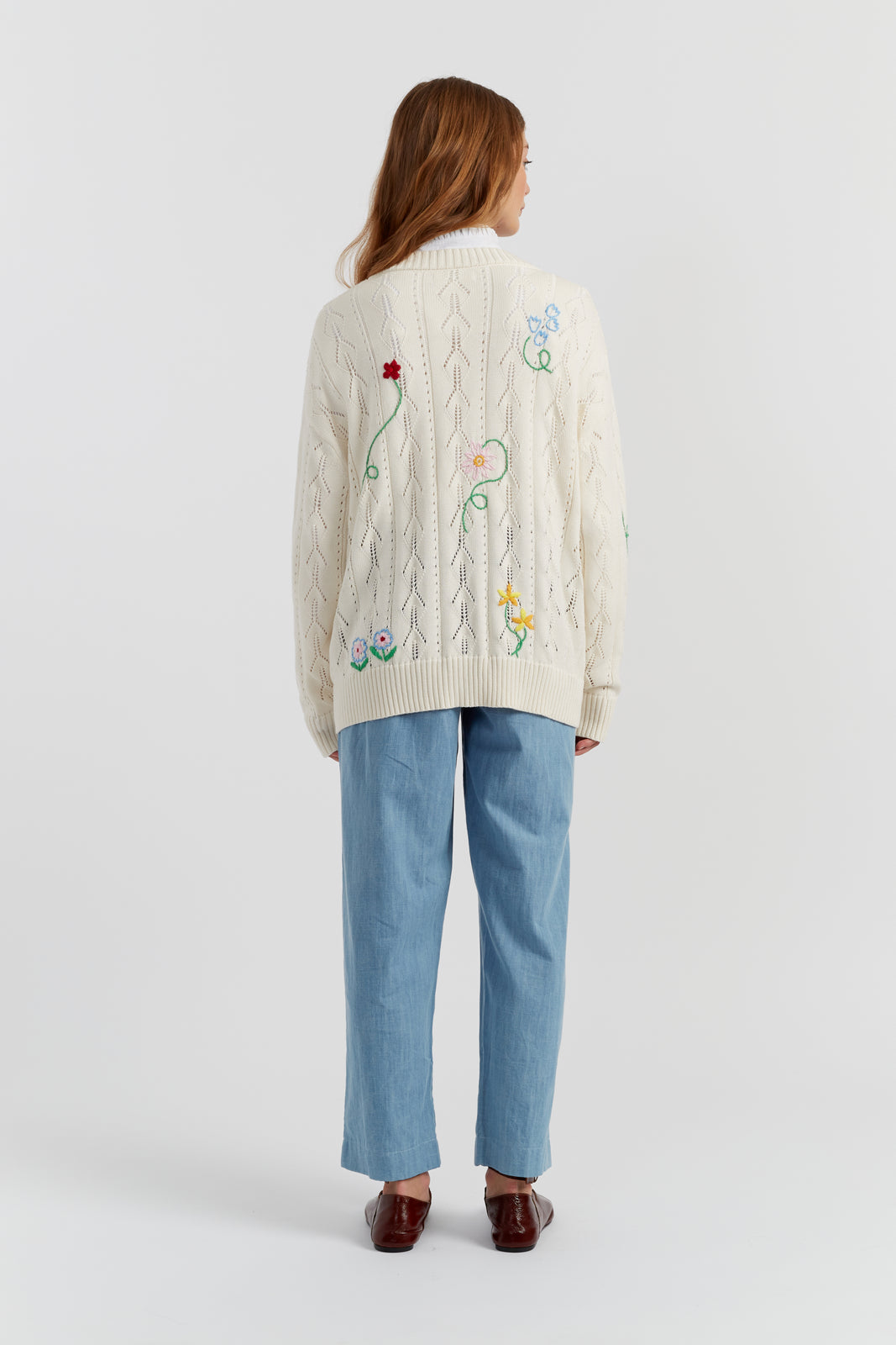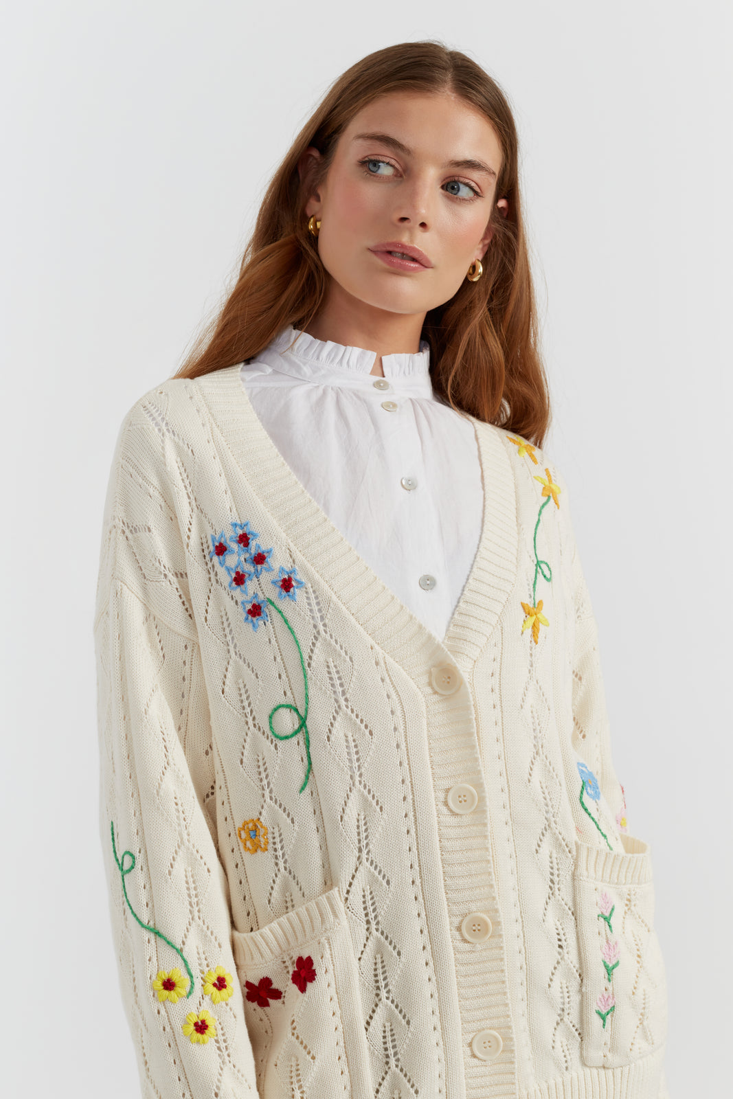 The Cream Cotton Hand Embroidered Floral Cardigan is a Slouchy.