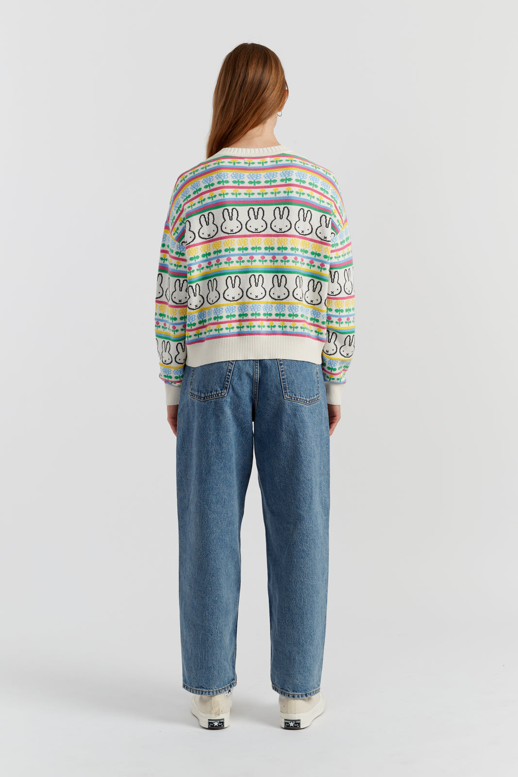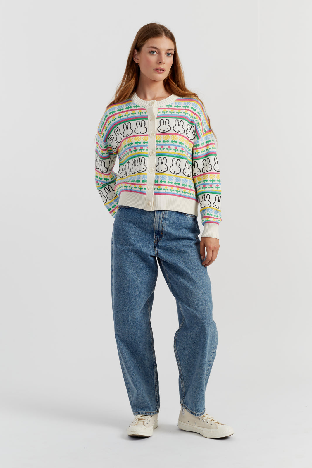 This cotton cardigan celebrates the playful spirit of Miffy through a delicately patterned Fairisle design in soft spring tones. Knitted in a light gauge with ribbed trims and a relaxed silhouette, it’s an uplifting piece to brighten any outfit.