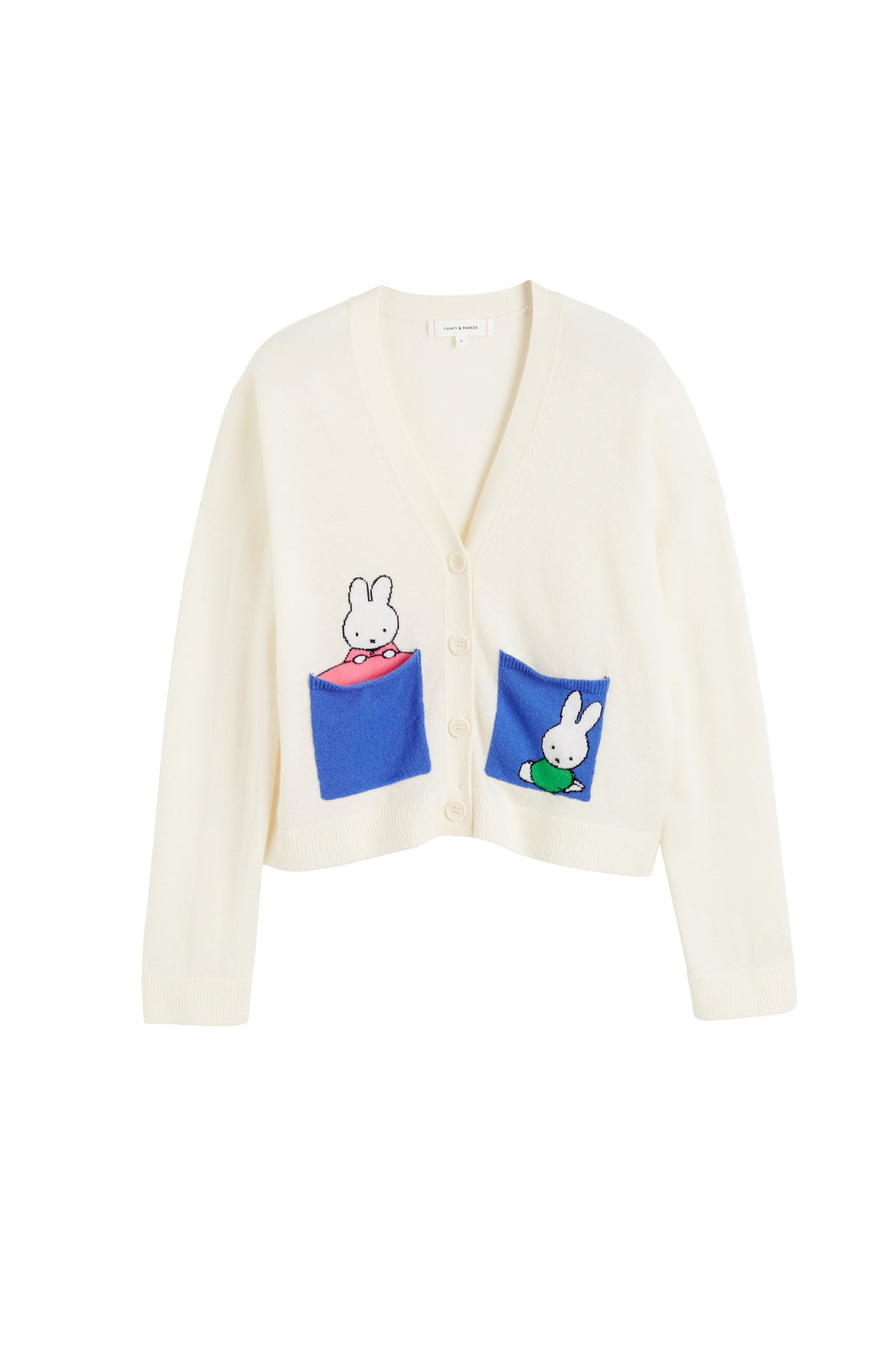 A joyful celebration of craftsmanship and character. Knitted from a soft wool and cashmere blend, this cardigan features two playful patch pockets, each showcasing a different embroidered Miffy motif. The standard knit and relaxed, boxy silhouette make it an easy, everyday layer that blends luxury with whimsy.
