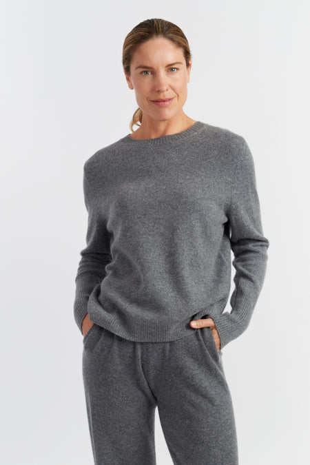 This grey sweater is a heavier 100% cashmere knit and offers a looser silhouette thanks to its side split hem. The Boxy also features deep ribbed cuffs and a deep rib along the back hem.