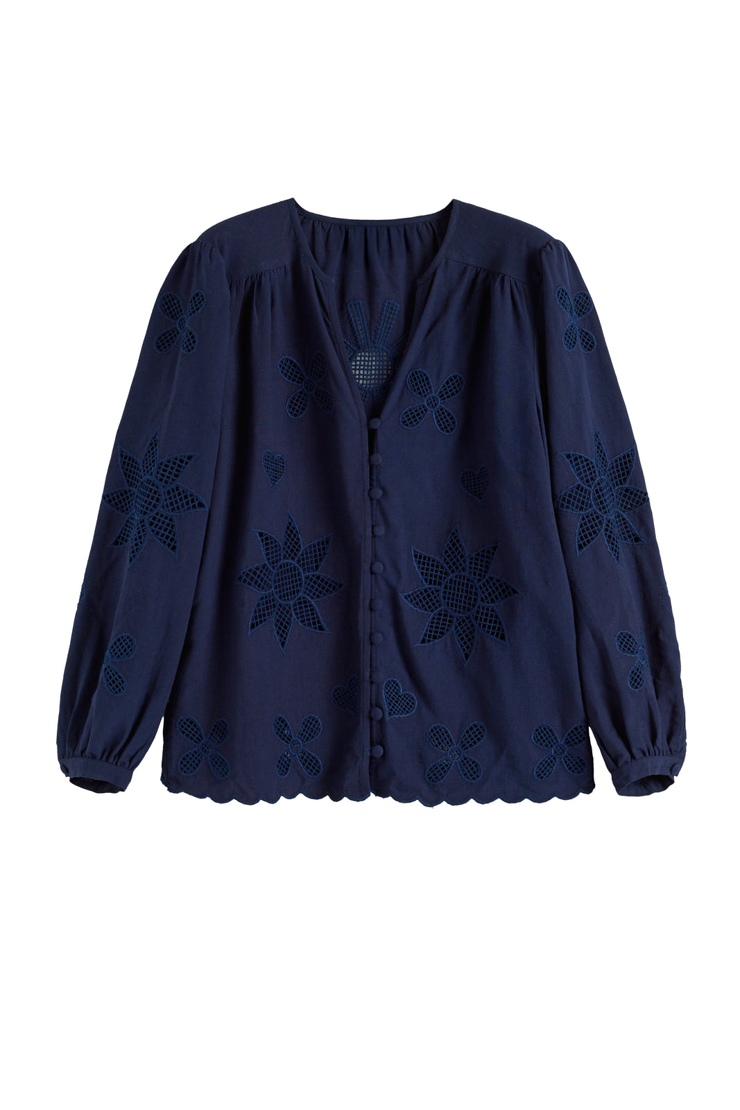 Cut from an airy linen-blend, the Navy broderie blouse is finished with intricate embroidery and a classic fit. Style with the matching skirt or wear with denim for relaxed, refined summer dressing.