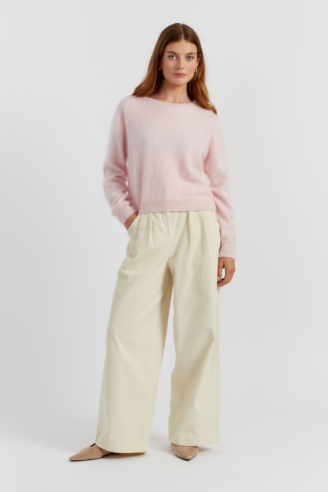 The Peachy-Pink Brushed Pure Cashmere Sweater is a Classic.