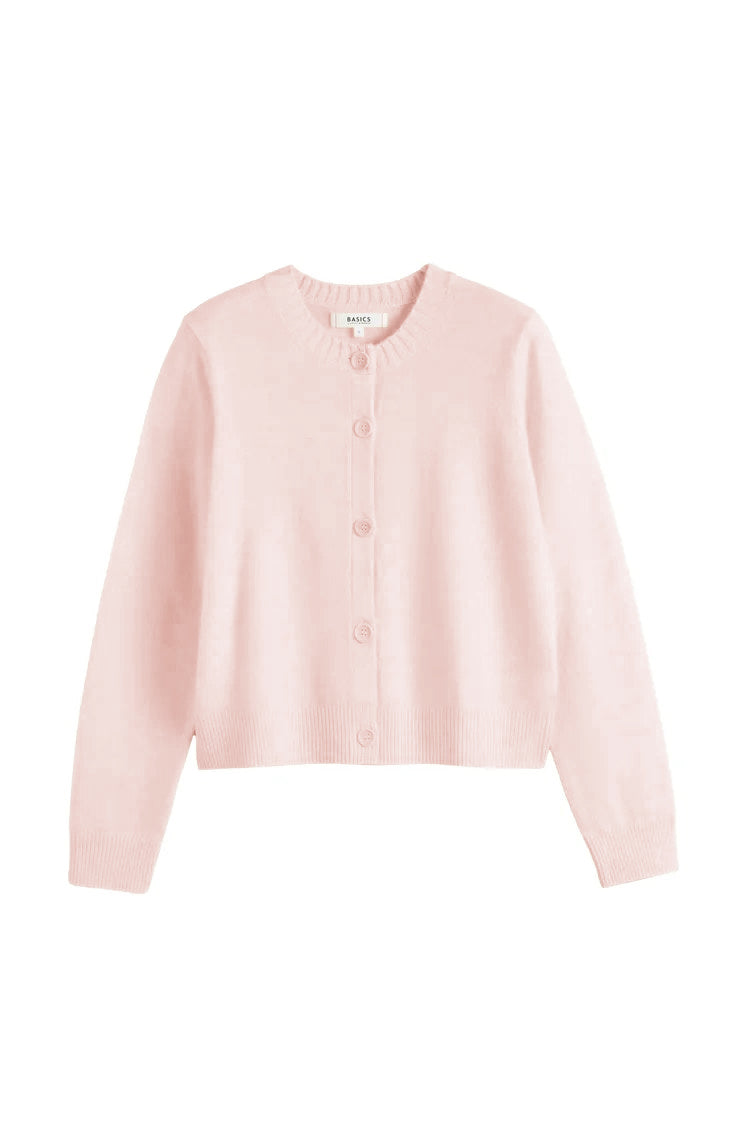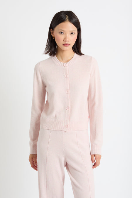 The Pink-Melange Wool-Cashmere Crew Neck Cardigan is a Classic.