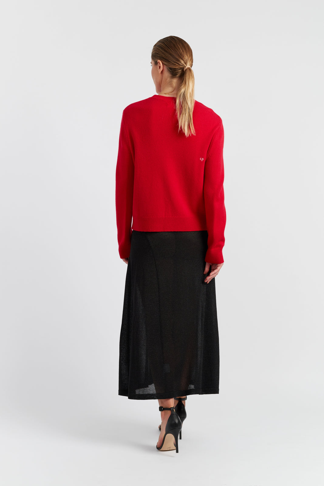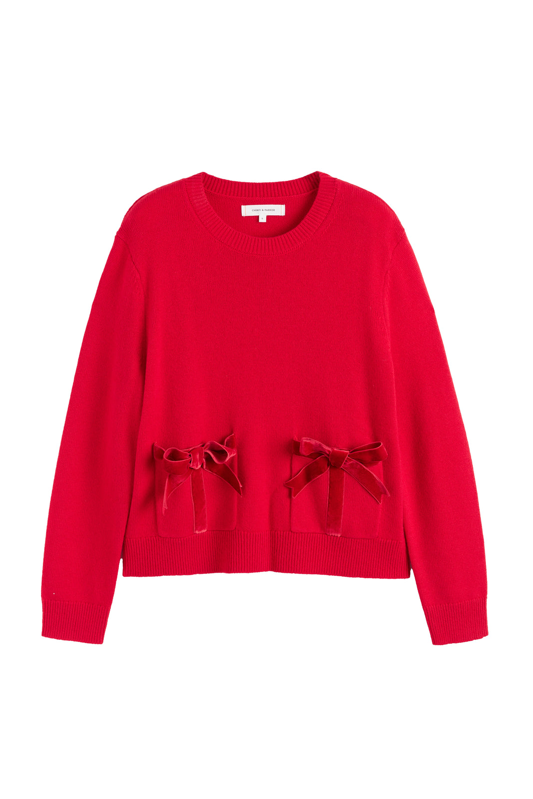 The sweetest knit of the season. This red crew neck jumper is made from our signature wool and cashmere blend, featuring two front pockets trimmed with red velvet bows — as if you’ve wrapped yourself up for Christmas.
