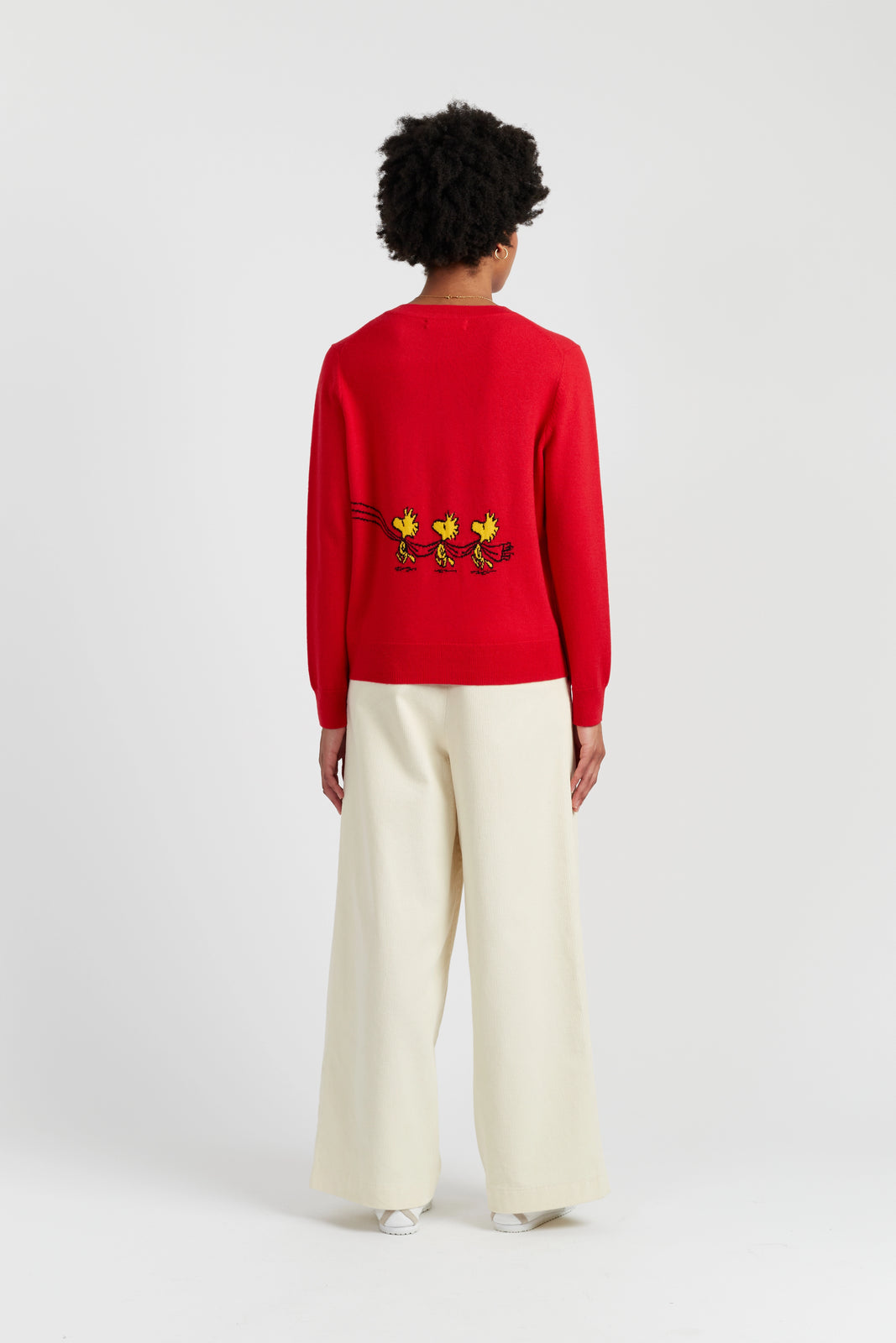 Celebrate the season with Snoopy in this joyful red crew neck sweater. Made from a luxe wool and cashmere blend, it features everyone's favourite beagle in his Santa hat and scarf — festive, cozy, and full of charm.